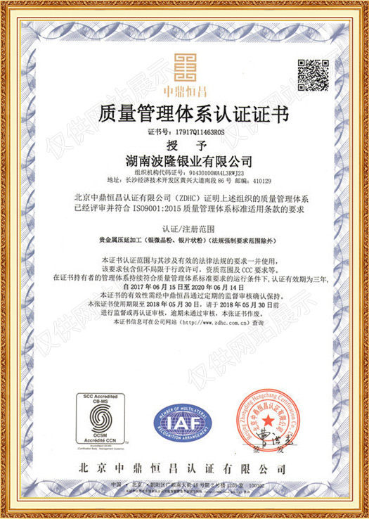 湖南波隆銀業(yè)有限公司是湖南波隆集團(tuán)股份有限公司的全資子公司,成立于2016年4月15日,注冊(cè)資金1000萬(wàn)。集白銀類(lèi)產(chǎn)品的研發(fā)、銷(xiāo)售于一體,年?duì)I收1.22億元。2017年6月底,湖南波隆銀業(yè)有限公司順利通過(guò)了ISO9001質(zhì)量體系管理認(rèn)證,并獲得了相關(guān)文件證書(shū),這標(biāo)志著波隆銀業(yè)逐步邁入規(guī)范化、標(biāo)準(zhǔn)化的現(xiàn)代企業(yè)管理軌道。