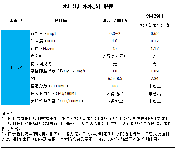 水廠出廠水水質日報表(2025-8-29)
