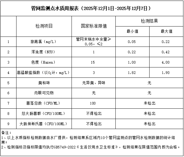 管網(wǎng)監(jiān)測點水質(zhì)周報表(2025年12月1日-2025年12月7日)