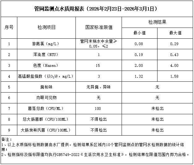 管網監測點水質周報表(2026年2月23日-2026年3月1日)