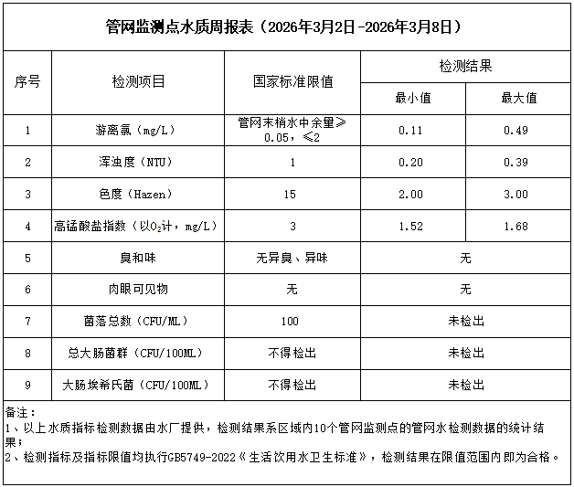 管網(wǎng)監(jiān)測點(diǎn)水質(zhì)周報(bào)表(2026年3月2日-2026年3月8日)
