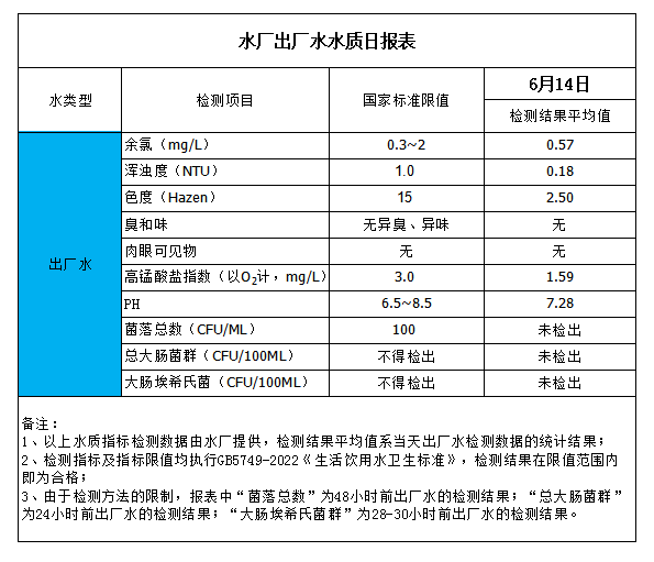 水廠出廠水水質(zhì)日?qǐng)?bào)表(2023-6-14)