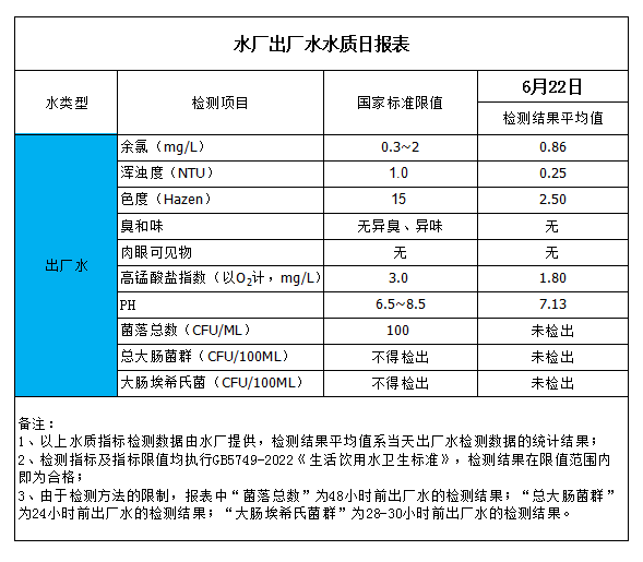 水廠出廠水水質(zhì)日報表(2023-6-22)