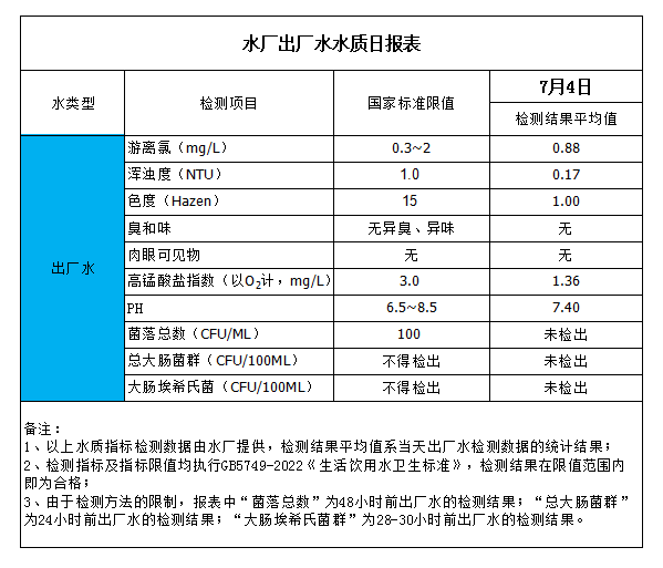 水廠出廠水水質(zhì)日報表(2023-7-4)