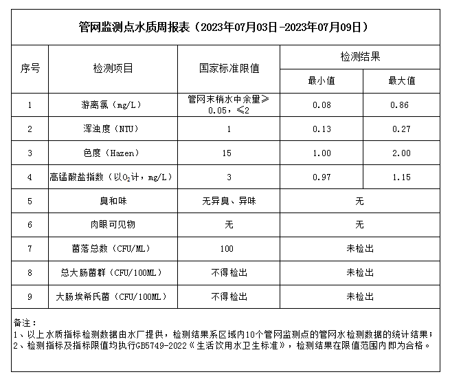 管網(wǎng)監(jiān)測點水質(zhì)周報表(2023年07月03日-2023年07月09日)