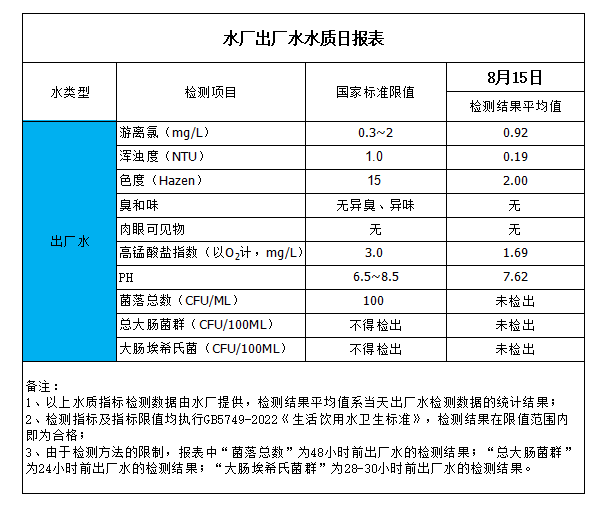 水廠出廠水水質日報表(2023-8-15)