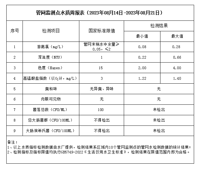 管網(wǎng)監(jiān)測點水質周報表(2023年08月14日-2023年08月21日)