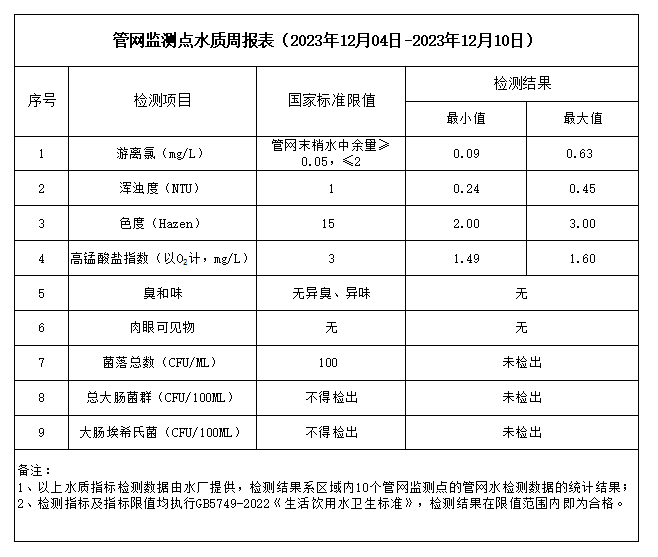 管網監測點水質周報表(2023年12月04日-2023年12月10日)